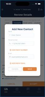 - When a driver is working on a load and they go to the DETAILS button, they now can add new contact info for the Pickups or Drop Offs associated to this load. Drivers can press Add New in the contact section and input the contacts name, up to 2 phone numbers and up to 2 email addresses. This information will be stored on the Setup > Locations > Pickup or Drop Off screen within the Phonebook.